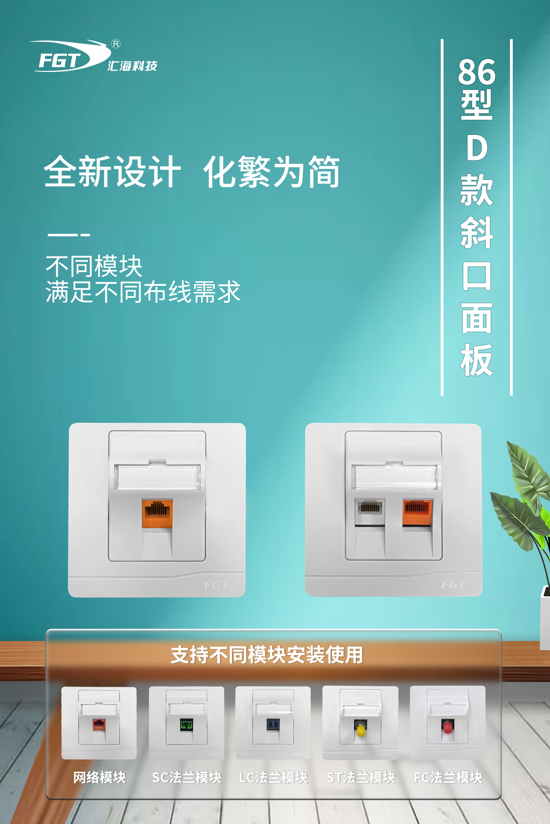 86型國際標準,面板表面看不見螺絲設計,適合多類型模塊安裝,應用于工作區布線子系統所有面板都帶有保護門,扣位式面板設計防止灰塵污染,嵌入式面框,安裝方便。