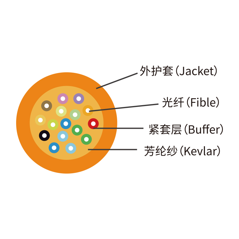 室內光纜是在緊套光纖外均勻增加加強作用的多股芳綸絲,再擠阻燃外護套而成.